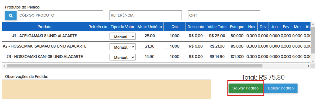 Passo 1 – Assim que você finalizar a adição dos produtos no pedido do cliente, você seleciona a opção Salvar pedido.