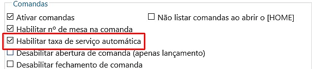 PDV > Menu > Habilitar Taxa de Serviço Automática > Confirmar