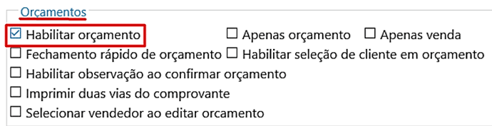 Passo 3 – Nas configurações vá até a parte de Orçamentos, marque a opção “Habilitar Orçamento” e confirme a configuração.
