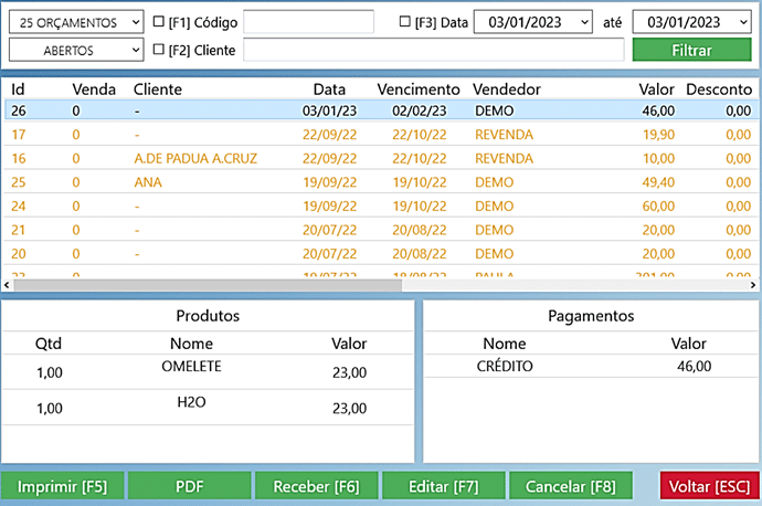 - Cancelar[F8]: Cancela o orçamento e solicita o motivo do cancelamento.