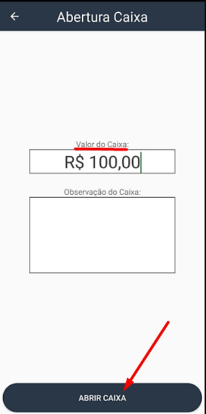 No campo Valor do Caixa pode ser informado o valor de troco que contém no caixa e no campo abaixo podera ser adicionado alguma observação.