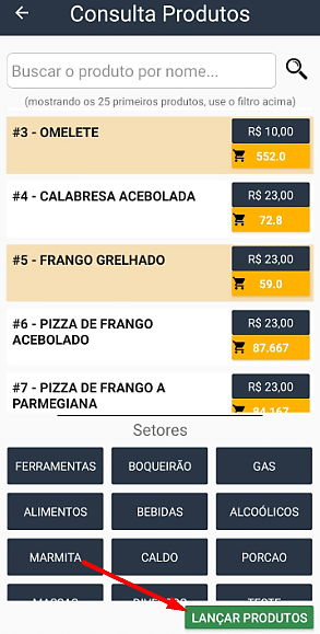 O terceiro modo é utilizando a lupa, localizada no canto direito da tela, clicando nela serão listados todos os produtos cadastrados no sistema.