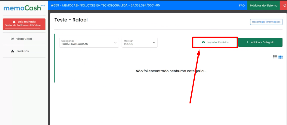 Passo 1: Os produtos contidos no cardápio do IFood serão importados para o MemoCash Web.