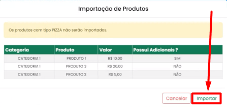 OBS: Os produtos com tipo PIZZA não serão importados.