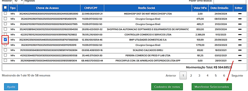 Passo 2 – Selecione a nota desejada no checkbox e clique em “Manifestar Selecionados“: