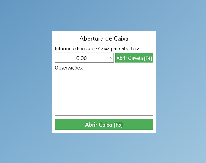Ao logar, aparecerá a tela de abertura de caixa onde será colocado no campo “Informe o fundo de Caixa para abertura” o valor de fundo de caixa, que é o valor de troco que o usuário terá para utilizar.