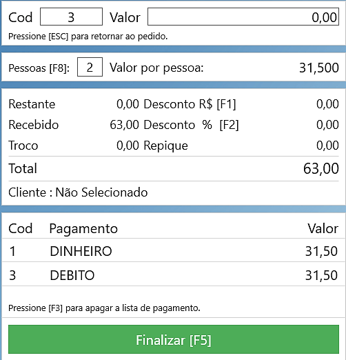 Agora que as formas de pagamento foram escolhidas basta clicar em “Finaliza[F5]” ou apertar F5 no teclado.