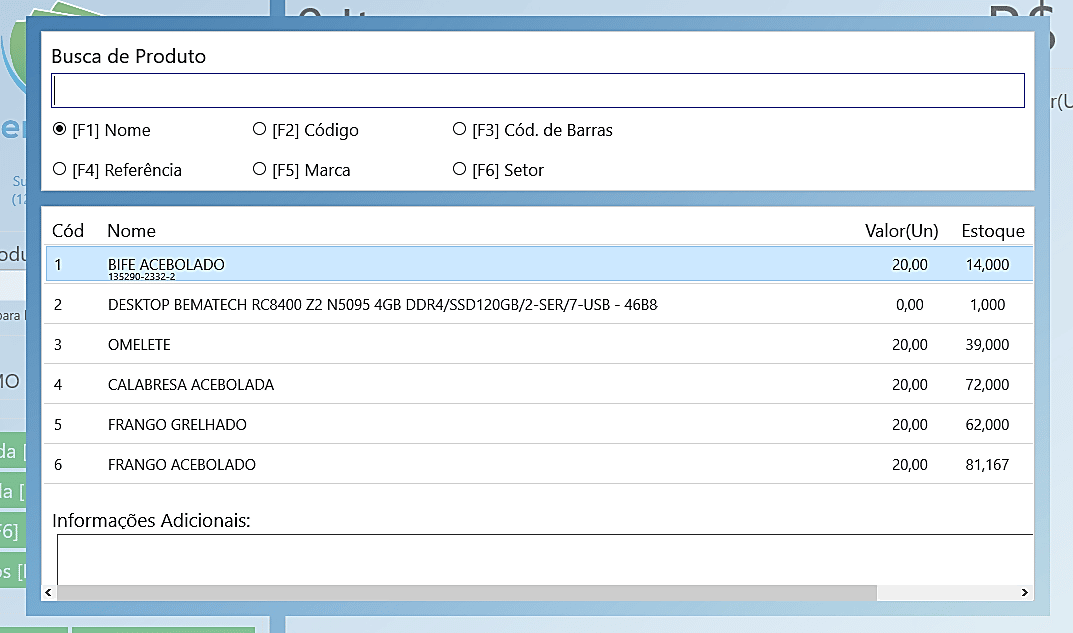 No exemplo utilizaremos a opção de buscar pela descrição do produto = Nome[F1]. Nesse caso utilizaremos a Porção.