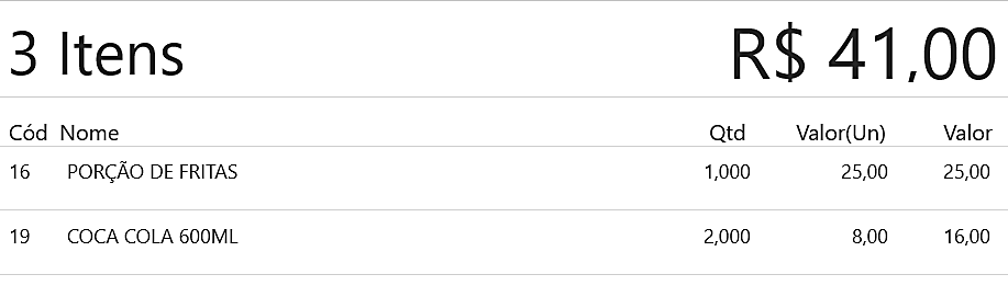Observe que no cabeçalho aparecem quantidade e valor total dos pordutos lançados e na linha de cada produto seu valor unitário e o valor total = Quant. X Valor Unitário.