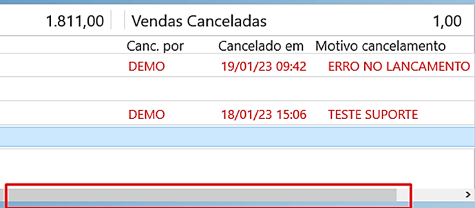 Após clicar em Confirmar a venda ficará em vermelho no sistema e ao utilizar o scroll na tela é possível visualizar o usuário, motivo e horário do cancelamento.