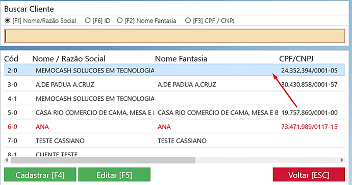 Passo 3 – Abrirá a listagem com os clientes cadastrados, selecione o cliente desejado clicando duas vezes sobre ele: