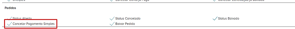 Passo 1 – Antes de iniciar o processo deve verificar se a opção “Módulo Pedidos” e “Cancelar pagamento Simples” está habilitada no cadastro do usuário.
