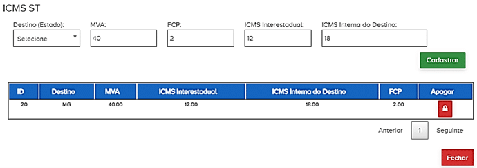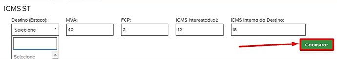 Passo 4 – Preencha as informações de Estado, MVA(Margem de Valor Agregado), ICMS Interestadual, ICSM Interna do Destino e FCP(Fundo de Combate a Pobreza).