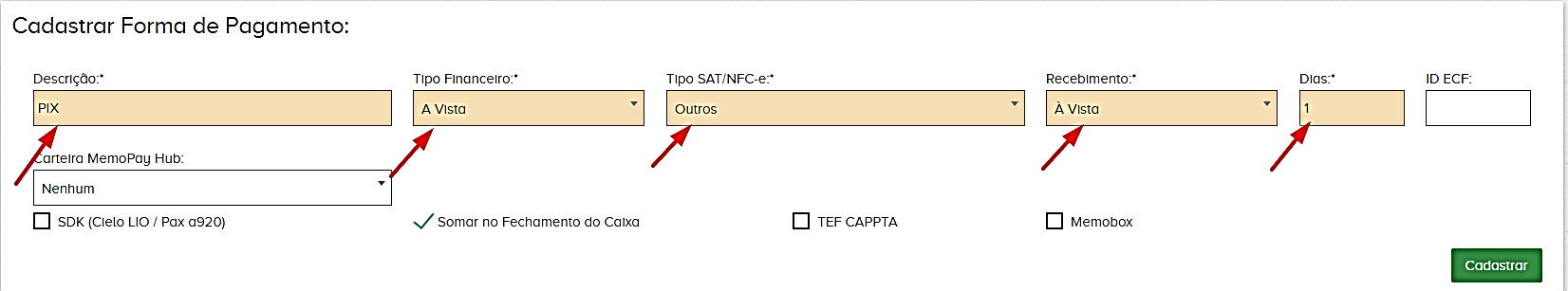 Ao finalizar clicar em “Cadastrar” para concluir a forma de pagamento.
