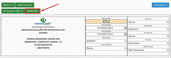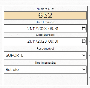 Passo 2 – No cabeçalho do CT-e é possível conferir o Número, data e hora da Emissão e Entrega da carga, qual o usuário Responsável pela emissão e o Tipo de Impressão que será utilizado: