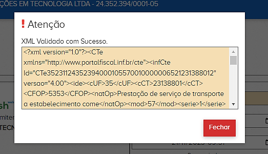 Caso apareça a mensagem de “XML Validado com Sucesso” você poderá fazer a Transmissão do CT-e normalmete.