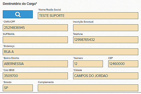 Passo 6 – No campo de Destinatário da Carga deverá ser inserido o cliente final da entrega: