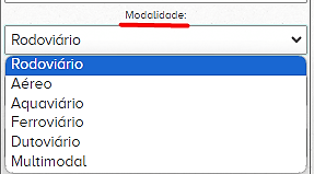 - Modalidade do Transporte: Rodoviário, Aéreo, Aquaviário, Ferroviário, Dutoviário e Multimodal.