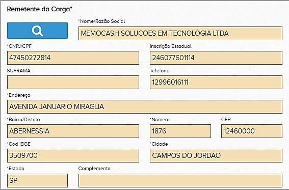 Passo 5 – Abaixo devem ser inseridas as informações do Remetente da Carga :
