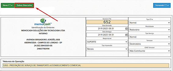 Passo 11 – Após o preenchimento completo da CT-e, volte ao inicio da página e clique em “Salvar Rascunho“: