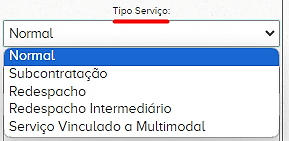 - Tipo de Serviço: Normal, Subcontratação, Redespacho, Redespacho Intermediário e Serviço Vinculado a Multimodal.