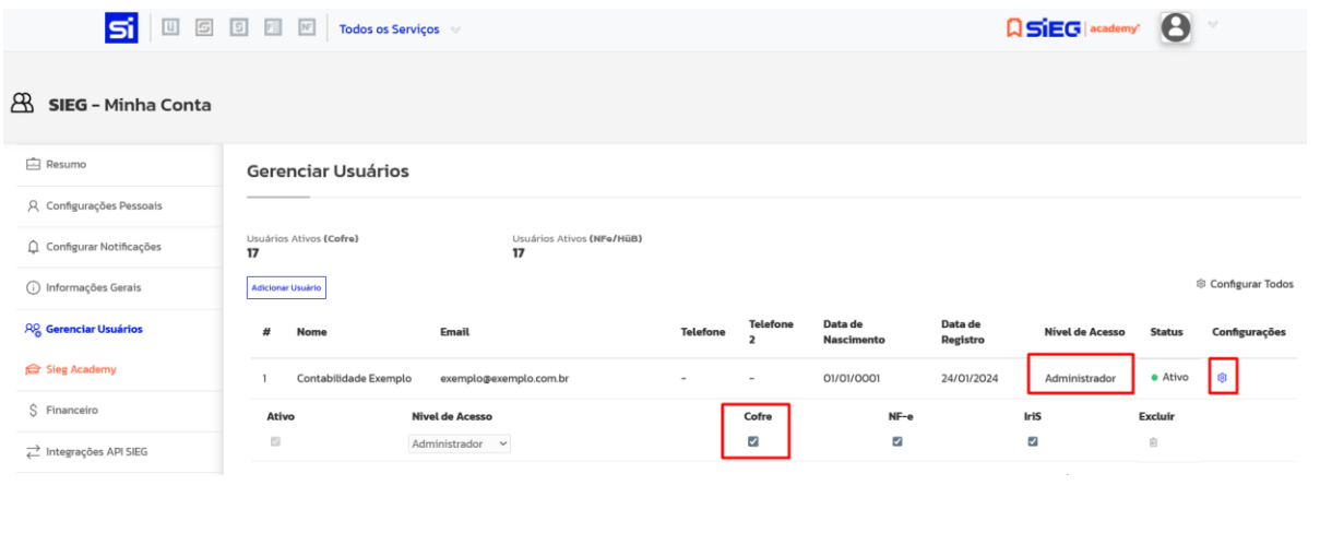 - Clique no ícone de engrenagem na coluna Configurações e marque a opção “Cofre”