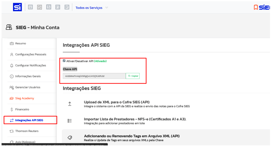 Passo 1 – Na aba Integrações API SIEG, marque a opção “Ativar/Desativar API” e copie a Chave API exibida no campo abaixo.