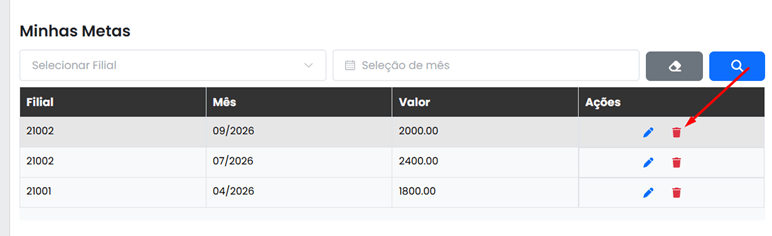 Passo 3 – Localize a meta que deseja excluir e clique no ícone da lixeira 🗑️: