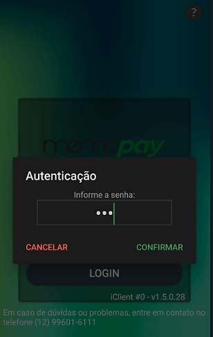 - Após fazer o download e clicar em “Abrir“, será exibida a tela inicial da memopay para fazer as configurações. No campo de Autenticação coloque a senha 321 para acessar as configurações: