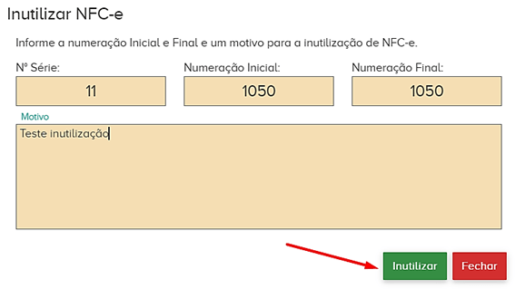 Retaguarda > Módulo PDV Balcão > Inutilização NFC-e > Inutilizar NFC-e