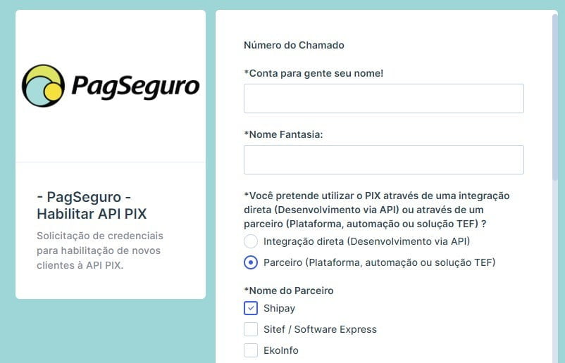 Escolha a opção “Parceiro(Plataforma, automação ou solução TEFF) e escolha em nome do Parceiro a Shipay.