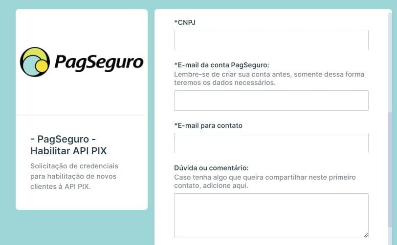 Preencha o seu CNPJ, email que usa em sua conta PagBank e um email para contato (pode ser o mesmo email que usou anteriormente). Pode ignorar dúvida e comentário.