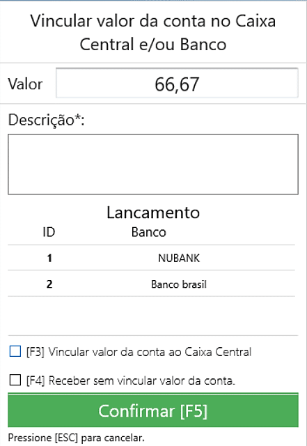 - Vincular Conta ao Recebe-la no Caixa Central e/ou Banco: Ao receber uma conta exibe as opções de vincular o valor a um banco, ao caixa central ou sem vincular a nenhum dos dois.