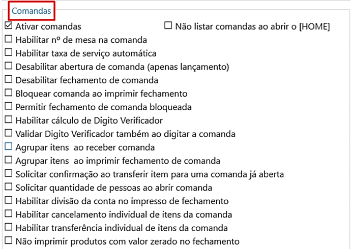 - Ativar Comandas: Habilita o campo de comandas para lançamento e listagem.