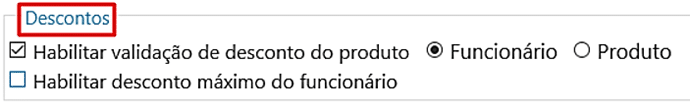 - Habilitar Validação de Desconto do Produto: Ao dar desconto em um produto, valida o máximo e o nível de desconto do funcionário que está fazendo a venda ou o máximo de desconto que pode ser dado no produto.