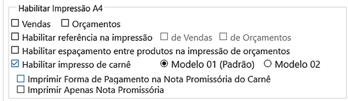 - Habilitar Impresso de Carnê: Permite a impressão de carnê na impressora A4.