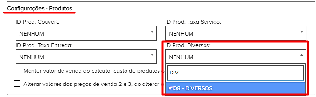 Passo 5 – Vá até a parte de “Configurações – Produtos” e no campo de ID Prod. Diversos insira o produto diversos que foi cadastrado.
