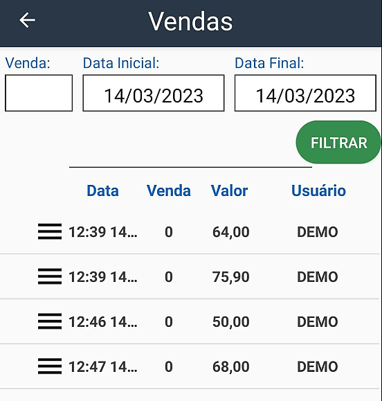 Passo 5 – Após clicar em filtrar serão exibidas as vendas feitas dentro do período selecionado: