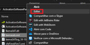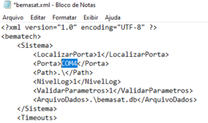 Passo 3 – Dentro da pasta do software vai ter um arquivo em XML com o nome de “bemasat.xml”, clique com o botão direito sobre ele e edite (ou abra com o bloco de notas).