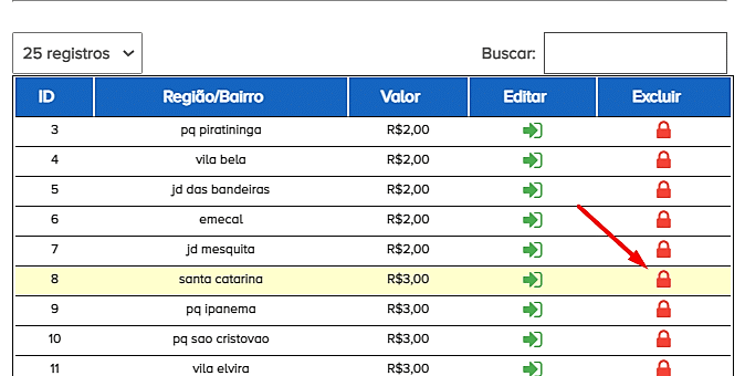Passo 3 – Na tela com a listagem das áreas, encontre a Área de Entrega que deseja excluir e clique no cadeado🔒 na coluna Excluir.