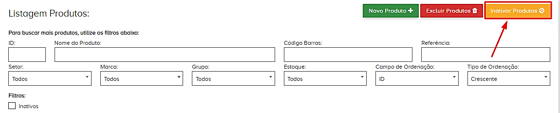 - Após selecionar os produtos desejados, clique no botão “Inativar Produtos” localizado no canto superior direito na tela.