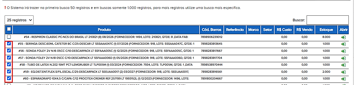 - Ao abrir a listagem de produtos, selecione os produtos que você deseja inativar pela caixa de seleção, como mostra a imagem:
