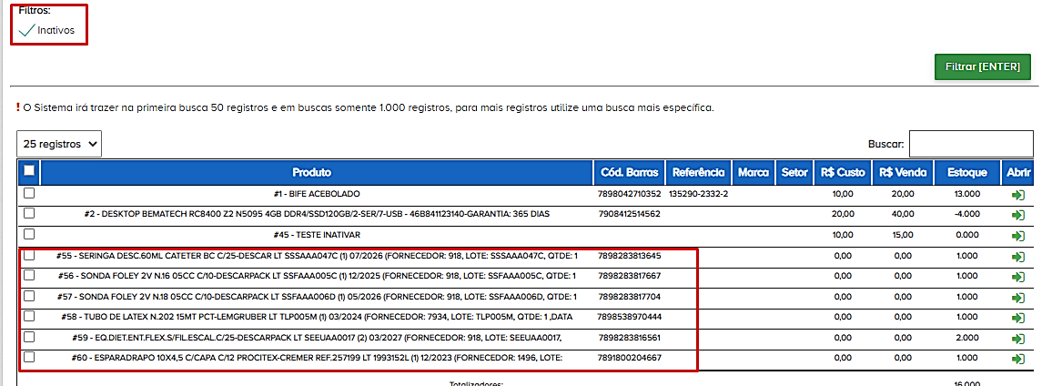 - Nessa mesma página clicando no filtro de inativos você terá acesso aos produtos inativos.