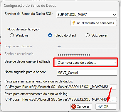 Passo 5 – Na tela de Configuração do Banco de Dados, selecione a opção “Criar nova base de dados…” e logo depois clique em “OK”.