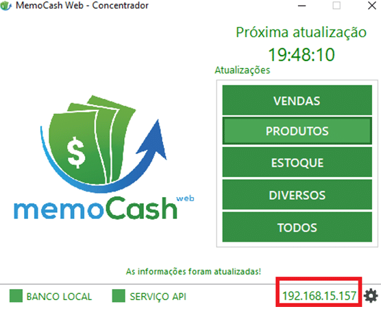 Passo 1 – Caso você use mais de um computador MemoCash, abra o concentrador no servidor e observe o IP que fica no canto inferior direito e anote este IP (não anote o número desta imagem, anote o número de IP do seu concentrador).