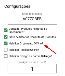 Passo 3 – Deixar a opção “Habilitar Orçamento Offline?” habilitada. Também é necessário que o tipo de conexão esteja como “1 – Concentrador” e esteja com o IP correto do servidor configurado.