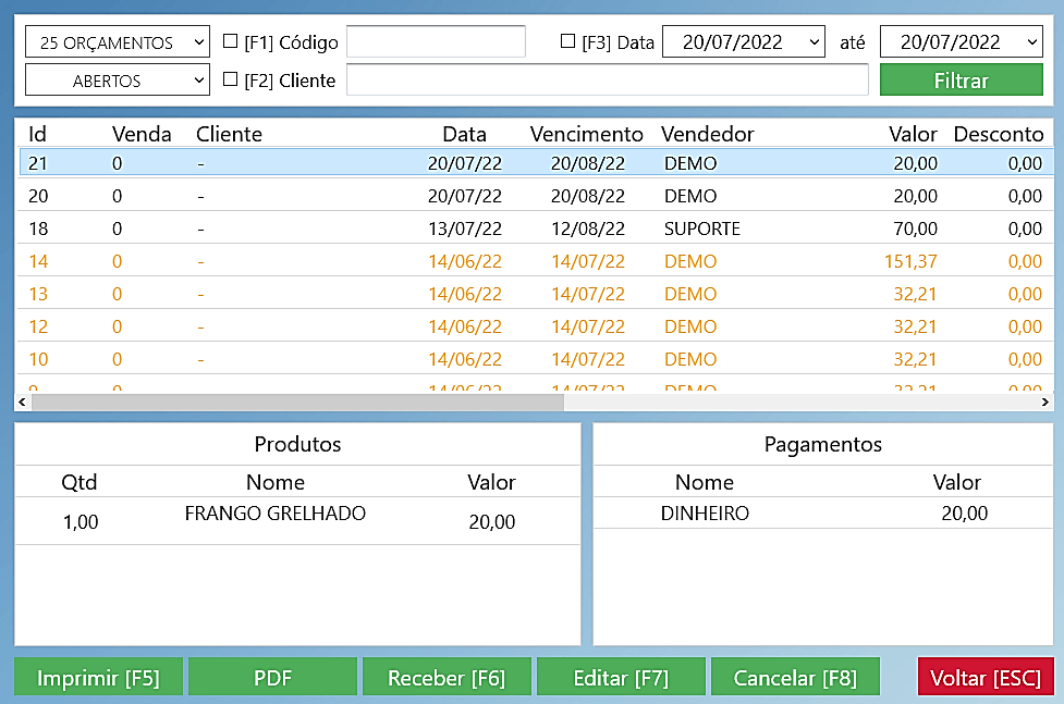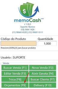 Passo 6 – Assim, esse orçamento ficará salvo no seu PDV. Para consultar o Orçamento basta abrir seu PDV no computador e clicar em “Orçamentos [F9]”.