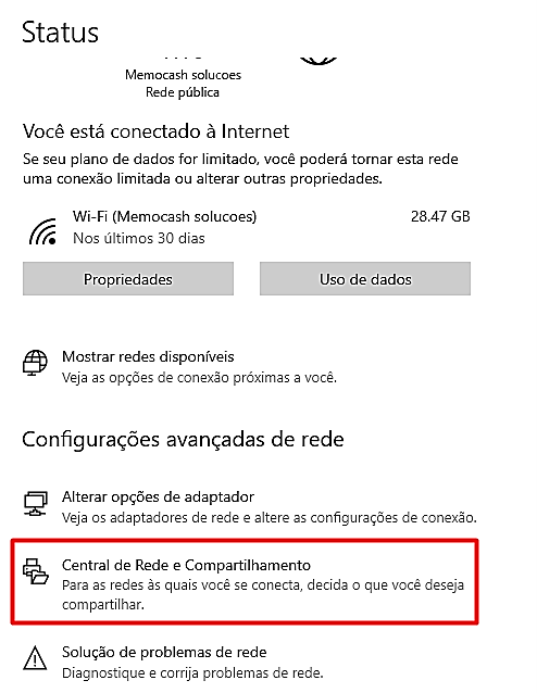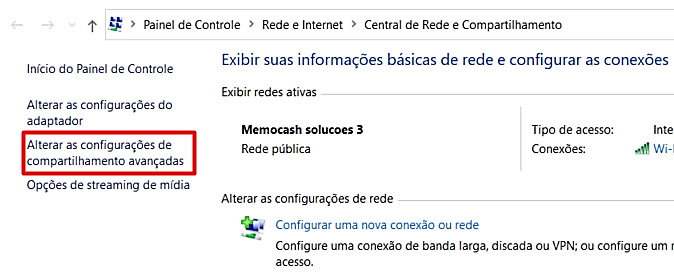 Passo 2 – Abra a opção de “Central de Rede e Compartilhamento” e depois clique na opção “Alterar as Configurações de Compartilhamento Avançadas”.