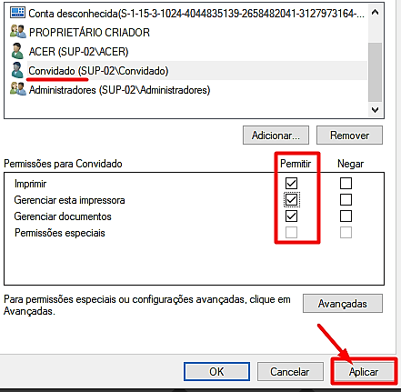 Passo 10 – No usuário Convidado, habilite as permissões de “Gerenciar Esta Impressora”, “Gerenciar Documentos” e “Permissões Especiais” conforme mostra a imagem.