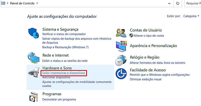 Passo 4 – Após configurada a rede, abra o Painel de Controle no computador em que a impressora está conectada e encontre a impressora em questão.